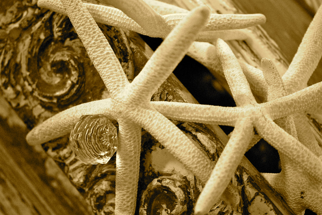 From The Coastal Collection photography series by Susan Fairgrieve, "Happy Stars" is a close-up of a white finger starfish dancing in an antique drawer with a crystal knob. Presented here in sepia tone for a unique and interesting feel. The incredible detail, tones and texture make this image crisp and clean for a refined coastal space. A perfect match is made when paired with one of our sepia tone canvas art print. When printed in a large format, 30" x 40" +, this is a statement piece for a large living space. A perfect addition to a coastal living space. Let us help you redefine your coastal space with one of our large canvas art prints.