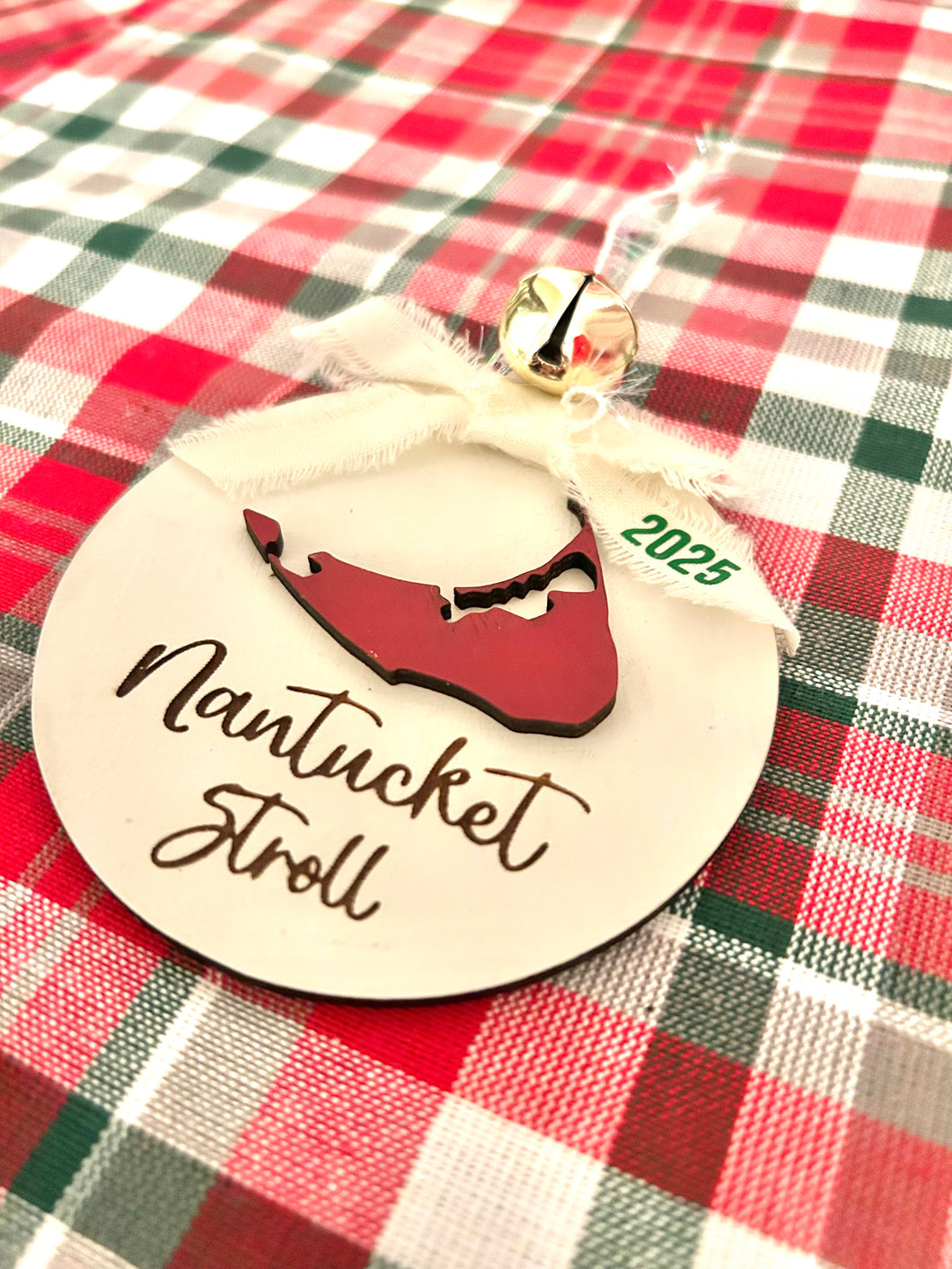 An adorable wooden ornament featuring Nantucket Stroll 2025, Nantucket Island painted in colonial red pops off this pale ivory, round ornament. The island is raised. A gold bell adorns the base of the ribbon. Ornament hangs with a sparkly tinsel ribbon and measures 3.5” round, not including ribbon.