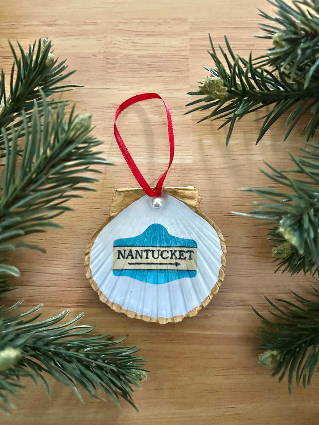 Aren’t these the sweetest little ornaments?! Created by artist Gretchen Madden, these ornaments are created from genuine Nantucket scallop shells. Nantucket Sign adorned with a pearl and red satin ribbon for hanging. Shells measure approx. 2 to 3” wide. No two alike as mother nature has created each one so uniquely. A sweet reminder of your favorite island!